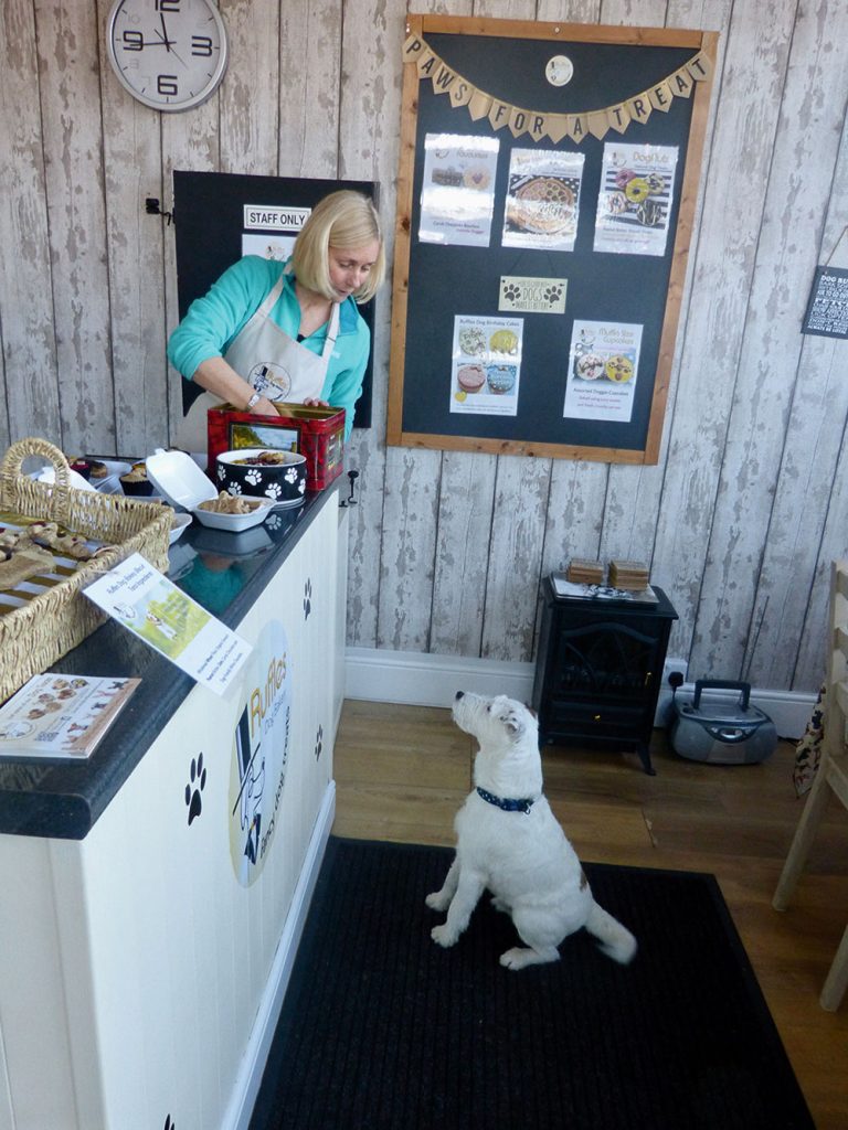 More and more restaurants and cafés are opening their doors to canine customers and Derby even has a fancy bakery exclusively for dogs. Taste Derbyshire’s Amanda Volley went along with her naughty pup Eddie to find out what would happen if you put a Jack Russell in a bakery. My Jack Russell, Eddie, is typical of his breed in that he lacks any kind of self-control around food. I say ‘food’ but some of the snacks he has enjoyed between meals include a clump of squirrel fur, an empty cake box, rabbit droppings and a hair bobble. Moreover, he has no qualms about stealing from shopping bags, picnic mats and the hands of old ladies trying to feed bread to birds. Which explains my trepidation when Eddie and I were invited to sample the culinary delights on offer at Ruffles; an upper-crust bakery on London Road, Alvaston, catering exclusively for dogs. Never mind sugarplums, I had visions of compensation claims dancing through my head. Owner Donna Wakeman, (54), was confident the quality of her bakes would be enough to turn Eddie from a treat-seeking missile into a perfectly behaved pooch worthy of top-notch nibbles. “I’ve never had a problem with a badly-behaved dog,” Donna smiles as she puts a selection of deliciously decorated gourmet bakes onto her counter. “I organise private parties which means all the dogs tend to know each other and we can just lock the door, let them off the lead and everyone can relax. Most dogs are a bit nervous in a new environment but yours seems lovely.” Remarkably, she is right. Subdued by the promise of free samples, Eddie looks ready to take his place in polite café society as Donna talks us through her morning’s baking. “The biscuits are made from healthy ingredients like wholemeal wheat flour, oats, and organic smooth peanut butter,” she says popping the odd morsel into the mouth of my canine companion. “They’re decorated with dog-friendly white chocolate or Carob and I only use natural colourings – the gold is turmeric which is great for doggies with arthritis and the pink is beetroot powder which tastes just like strawberry. They are delicious with no hidden nasties. The only things I ever add are natural ingredients like fresh herbs and grated carrot.” As Eddie casts an approving eye over the delightfully decorated ice cream cones, cup-cakes and DogNuts (dog-friendly doughnuts), Donna explains why she began baking for dogs. “I started making homemade treats because my rescue dog Alfie, now four, was such a fussy eater,” explains Donna, of Boulton Moor. “We were trying to train him with supermarket treats but he’d either ignore them or go and bury them. I found lots of dog treats recipes on the internet but it took three months of trial, error and tweaking to get one Alfie loved.” It wasn’t just Alfie who turned somersaults for the snacks. “My friend’s dogs liked them so much, they started putting in orders and it just snowballed from there,” she laughs.“I’m a web-designer so I decided to launch an on-line business. The bakery’s name was inspired by a visit to Raffles Hotel in Singapore. My logo is a dog in a top hat, monocle and bow tie and people love it so much, I’m thinking about putting it on a range of accessories like feeding bowls.” The on-line bakery business was so successful, Donna soon out-grew her home kitchen. “When I moved here in July 2018, I was attracted by the large kitchen and I knew the position on a busy, main road into Derby was useful for advertising to potential customers,” Donna says. “Last Christmas, they were queuing out the door. One chap, who was just working in the area, came in and bought ten doggie hampers which included treats shaped like fir trees, turkeys and puddings. This month (February) I’ll be making lots of love hearts for Valentines.” There’s room in the bakery for doggy toys and accessories (Eddie was excited to find dog-friendly Prosecco ‘Pawsecco’ and beer on the shelves) and an enormous table for all the doggie events. “I love catering for afternoon teas and birthday parties. I’ll make dog- friendly sandwiches like peanut butter and cream cheese and serve them from a tiered cake stand,” says Donna.“The selection will include biscuits like the bourbons and custard creams, eclairs, cup-cakes and DogNuts. The owners often bring hats and I play doggie themed music and I always make a special cake for the day.” Donna is understandably proud of her occasion cakes and gives me a sneak preview of one smothered in pink frosting which she’s made for a lucky pup called Luna. “The cakes are made from self-raising wholemeal flour, my homemade apple puree, peanut butter and grated carrot,” she explains.“They are made fresh to order and, if kept in the fridge, they should last up to ten days. Not that I’ve heard a dog ever taking that long to eat one.” As if on cue, we are joined by loyal customer Ella Conway who is at the bakery to buy special goodies for her pet chihuahuas Alfie and Ziggy. “They love coming to Ruffles. If I even mention the name, they start barking and run to the door,” laughs Ella Conway (20), of Shelton Lock. “You can’t buy anything like this at the pet stores. Donna even makes spongy treats for Alfie as he’s eleven now and only has a few teeth. Donna sells fish and chip and pizza shaped biscuits so we can all have a take-away night.” In the long-term Donna would love to branch out into offering franchises as she’d love to see a Ruffles Dog Bakery in places up and down the country. For now, she is content with fulfilling her many orders, hosting canine celebrations and developing new lines including a dog-friendly cocktail called ‘Singa-paw Sling”. “I do have people who think the idea of a dog bakery is a little crazy or that you