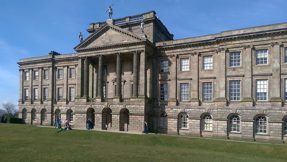 DISTANCE: 3½ miles (5.6km) of moderate forest track, open moorland, surfaced road, waymarked field path and rough access drive. 525 foot (160m) climb. RECOMMENDED MAP: Ordnance Survey Outdoor Leisure Sheet 1, Dark Peak. 1:25,000 scale. PUBLIC TRANSPORT: Hourly TP service buses to Buxton, then bus or train to Disley where a short walk along a back road leads to the driveway beyond North Lodge. CAR PARKING: Official car park below Lyme Hall. Pay and display on entering the park via North Lodge on the A6. Access to Lyme is free for National Trust members. REFRESHMENT: Old Workshop near pond beyond the car park. I thought I had finished my walks from and around the grand houses up and down the Peak District, but recently it was brought to my attention that there is at least one other I have overlooked. This is Lyme Park, the grand Palladian mansion set in the heart of 1,400 acres of woodland and high moors on the north western boundary of the Peak District National Park. A mere ten miles or so from the southern boundary of Greater Manchester, it acts as a popular breathing space for the citizens of towns surrounding what was once called Cottonopolis. Having said that, access is easy for anyone living more to the south; the A6 passes the northern entrance to the park, and regular trains and buses from Buxton stop at nearby Disley. Now jointly owned by Stockport Metropolitan Borough Council and the National Trust, Lyme was the ancestral home of the Legh family for over five and a half centuries. Originally created by King Richard II who in 1398 granted land in the Royal Forest of Macclesfield to Piers Legh and his wife Margaret D’anyers. Over the centuries what was once a hunting lodge became the magnificent Palladian mansion set amongst a rolling moorland background and the attractive formal and informal gardens of today. Orangeries and sheltered rose gardens compete throughout the seasons to the delight of visitors, but it is the Dutch garden on a terrace below the west side of the house which draws the greatest admiration when its formal displays of tulips are at their best. It is not just the house and gardens that visitors come to see. High on a ridge overlooking the main driveway from the A6, a prospect tower known as ‘The Cage’ offers wide ranging views over the Cheshire Plain where, on a clear day the outliers of the Welsh giants of Snowdonia come into view. Another reason why visitors come to admire and enjoy the house and moorland walks on offer, is thanks no less to the BBC. In 1995 Lyme became immortalised as Pemberley in the BBC TV production of Jane Austen’s Pride and Prejudice. The walk passes the pond where semi-naked Mr Darcy (played by Colin Firth) unexpectedly emerges from a lake in full view of Elizabeth Bennet, played by Jennifer Ehle. The walk passes the pond, but be prepared for a surprise, not only will there be no Dashing Mr Darcy, but the pond is usually a muddy slimy affair, hardly something to attract a swimmer on a hot summer’s day. Starting from the car park below the hall, the walk climbs out through Knightslow Wood, out on to Park Moor where you might be rewarded with a view of magnificent red deer, part of the herds roaming unhindered throughout the park. At the top of the climb an enigmatic pair of upright stones known imaginatively as the Bowstones, are probably the remains of two late Saxon preaching crosses, minus their cross pieces. Bowstones is the highest point of the walk. An access lane from the remote farmhouse drops down to a side road linking Kettleshulme and Disley, but the walk does not join it. A left turn on to a farm track leads to open fields as far as the old eastern route into Lyme. Turning left at East Lodge the walk follows this old track back to the hall and the welcoming refreshment stop at the old timber yard and its workshops. The Walk 1 From the car park, turn left away from the hall and follow the surfaced lane curving left, uphill. 2 Turn left on to a wide track at the top of the hill and go through a metal swing-gate. 3 Following a Gritstone Trail signpost, continue uphill with trees on your left and rough moorland fields to the right. Although there is no access from the track you should be able to get a glimpse to your left of the small pond where Colin Firth aka Mr Darcy emerged under the flustered gaze of Elizabeth Bennet (played by Jennifer Ehle in the BBC adaptation of Pride and Prejudice). 4 Enjoying views of Lyme Hall on your left, go through Knightslow Wood, following the track until it reaches the park boundary. 5 Cross or go through the wall and turn left on to a rough path climbing steadily uphill. Aim for a group of telecommunication masts on the ridge-top ahead. 6 Climb over the moorland boundary wall and keeping to the right of Bowstones Farmhouse, aim towards the farmhouse’s access drive. Two enigmatic stones within a small iron-fenced enclosure are the Bowstones. Folklore says they were used for bending new bows in Saxon times, but they are more likely to be the uprights of a pair of late Saxon preaching crosses with their cross pieces broken off by zealots during the Commonwealth following the English Civil War. 7 Walk down the drive for about a mile until it meets the main road and almost immediately turn left on to a farm lane. 8 Follow the lane as far as Cock Knoll Farm. 9 Go through the farmyard as directed by waymarking signs and out through a gate. 10 Following a boundary wall, go down the left side of the couple of fields beyond the farm. 11 Descend into and cross a shallow valley on a waymarked field