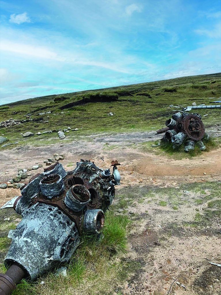 by Brian Spencer Pennine Way walkers almost at the southern end of their epic trek from Edale to Kirk Yetholm look on the crossing of Bleaklow as almost the end of the first day’s section of the ‘Way’. Grateful to enjoy a spell of comparatively easy walking on a path made from flagstones, the walker, if they know the part of Bleaklow where they are, spare a few minutes to make a diversion. About a mile west in the direction of Glossop, Shelf Stones, is a 621 metre high ridge, an unforgiving couple of metres below the moorland crest, the ground is littered with the remains of aircraft wreckage. Closer investigation by those with keen eyesight will spot items stamped with U.S. military reference data. This is all that remains of a U.S. Flying Fortress, once affectionately known as Over Exposed by those who flew in her. Built by Boeing and officially known by its manufacturer’s reference as RB-29A-4-44, she weighed 55,000 lbs fully loaded (36lbbs net), and was powered by four massive rotary engines, two on each wing. First flown in July 1946, she entered military service too late for the actual World War 2 fighting, but was converted to carry photographic personnel and their equipment after joining the 16th reconnaissance Group’s 311st Air Division, photographing the first atomic bomb test, on Bikini Athol, and also took part in the Berlin airlift when the city was effectively held to ransom. Based at Burtonwood American air base near Warrington, Over Exposed ended its working days carrying a team of seven trainee photographers as well as its crew. Weather as we know only too well is, in late autumn, usually damp and misty with poor visibility. The navigator was forced to plan a route by instruments alone, but with all the flight crew fully trained and experienced, the crew and passengers were fully confident of their ability to carry out their planned task. The task they were set was first to fly to Scampton RAF base in Lincolnshire in order to pick up money for the wages of colleagues (and themselves) at their base. This they managed quite easily, leaving Scampton at around 10:15 on 3rd November 1948 in order to give the photographers and navigator’s experience of route finding, probably over hilly country in poor visibility, so a complex cross country flight plan was lodged. This involved changing the route in order to fly west over the highest ground in the District, then flying due west, gradually descending over Glossop and south Manchester to Burtonwood airbase. The navigational task the crew had to answer first involved descending as low as possible in order to get beneath the low clouds. Fortunately the navigator and pilots had the help of scientific instruments to help them find the way, but it is at this point that things went wrong. Was it instrument error? If so it eventually caused the disaster, or maybe sheer carelessness? What ever happened will never be known, the instruments were up-to-date and the navigators experienced. All that is known is that Over Exposed though old in years was flying just a metre or so too low in order to clear the summit of Shelf Stones, almost a matter of inches between life and death. AFTER THE CRASH On the fateful morning of 3rd November 1948 an RAF Search & Rescue team operating from their base at Harpur Hill near Buxton happened to be involved in a training exercise on Kinder Scout. The team arrived at the summit of the Snake Pass at around 4:30 p.m, and despite thick mist, they were able to pin-point the position of Over Exposed crashed on Shelf Stones. Using the summit of the Snake Road as a base they quickly headed for the apparent site of the crash on Shelf Stones. Despite the fairly quick time it took to reach the accident site, as it was readily marked by burning parts of the fuselage; the easiest recognisable item was the tail fin. Only badly distorted remains of crew members were found and the macabre job of carrying them to the Snake Road and eventual identification. The aircraft was found to be carrying about $7400, mainly in paper currency which had surprisingly managed to survive the crash and subsequent fire. All of the money down to the last few dollars was recovered by American Military Police. Immediately after the accident, a large section of the main fuselage was easily recognisable and in fact for several years became a simple bothy providing accommodation for hardy souls intent on spending the night on Bleaklow. Unfortunately less careful visitors no longer look after it so well and, together with vandals, and trophy seekers, very little remains of the original wreckage. However, an attempt has been made to preserve the memory of those who flew on Over Exposed on that fateful day. They are, commemorated on a named military-style grave stone, the centre piece of an annual service at the site. Super Fortress Over Exposed crew and passengers commemorated at the crash site on Shelf Stones Moor. Much of the wreckage of Flying Fortress Over Exposed and items connected to it can still be recognised by those with appropriate training, especially parts of the four turbo-engines, but should be left for future archaeologists to examine. In total there are seven wrecks dating from 1939 to 1956 scattered around Bleaklow and associated moors and are mostly the final resting place of those who flew over the wild moors. Please do not remove any items from the wreck sites without permission. 00