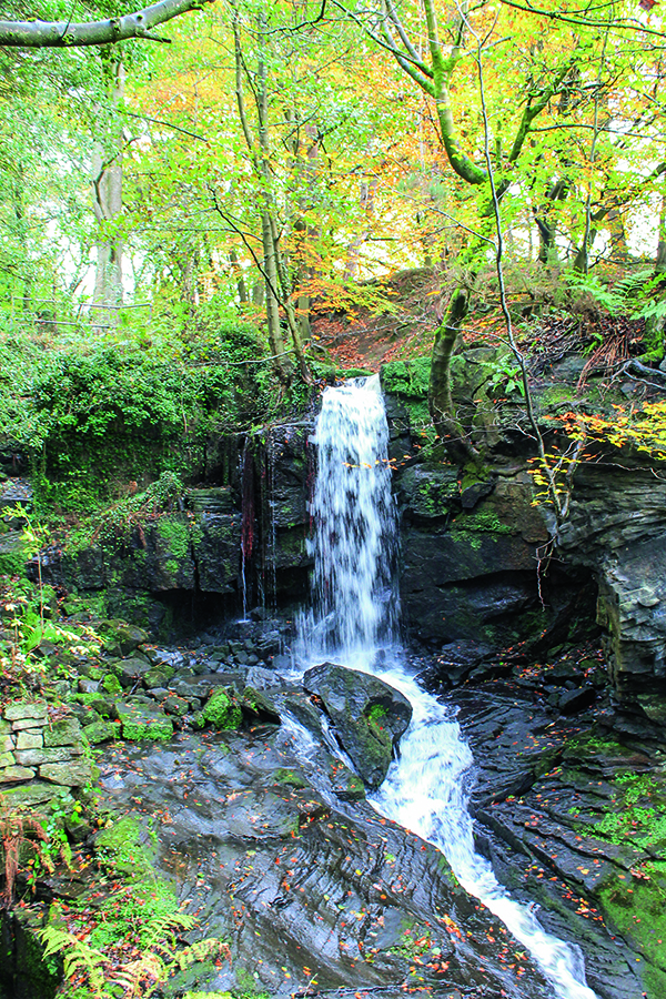 Below Farm Dam and its bulrushes, is the hiding place of mallards. Hard by adjacent picnic seats, water pours through a still viable sluice, then down a spectacular waterfall part hidden by beech shaded rocks. A now dry side leat carried water into a deep wheel pit where a mill was later adapted for sawing timber, or ground lead oxides for the paint industry.