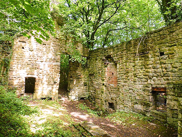 By parking in the lay-by opposite the entrance to Highfields School on Lumsdale Road, the valley and its ruins can be explored by a rocky footpath winding its way steeply into the valley bottom. Walk gently downhill past the boggy remnants of the first two ponds and with a little care you can see the overgrown ruins of the 16th century Bone Mill. The still recognisable wheel pit and its tail race back into Bentley Brook drove massive grindstones and pulverising hammers to break down calcined bones for use in the pottery industry or as fertiliser. Following the path past the third dam and a group of cottages, the next mill was until the twentieth century used as a saw mill, but initially it was a corn mill, and the huge grindstone imported from the Massif Central in France lies close to the tail-race.