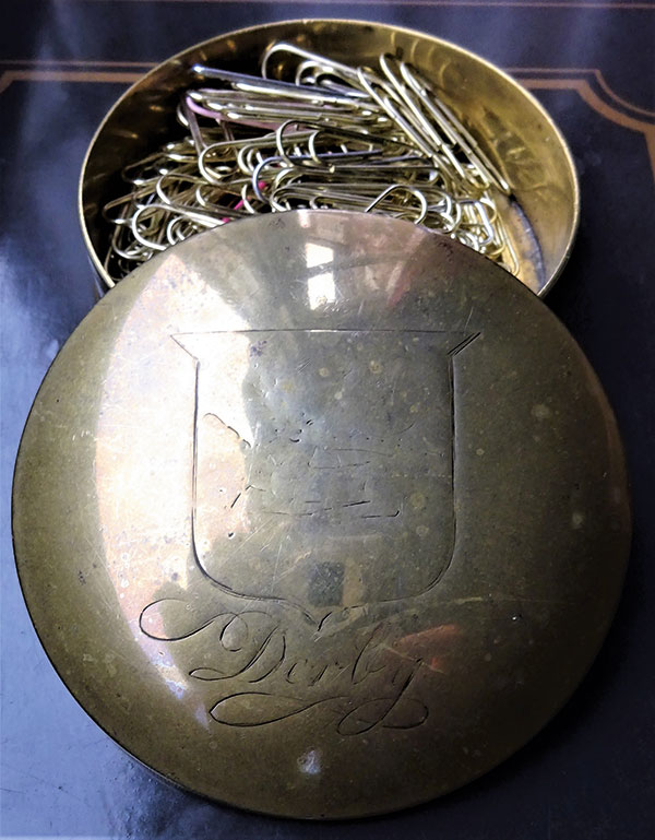 On my desk at home is a small brass receptacle in which I have always kept my paperclips. It is brass, of circular form and has a domed brass lid engraved, a little crudely, with the arms of Derby, and with the word Derby below it. The top fits the base with wonderful accuracy, and the base was made from a 75mm French shell case and the lid adapted from a 77mm German field gun shell case. I bought it on the market for a pound when I was education officer at the Museum, merely because it was a local souvenir.