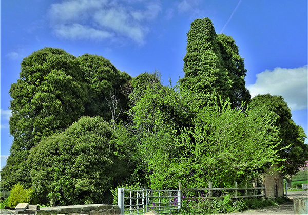 When Mick Stanley and I first visited, in winter 1980/1981 whilst researching the first edition of The Derbyshire Country House, it was moderately visible, standing gaunt to a considerable height; when Carole and I revisited to make a more up-to-date photograph for my forthcoming book on lost Derbyshire houses (from Amberley, expected early next year, thanks to Covid delays) we found it utterly invisible, despite it being April 2021: it was completely swathed in greenery – a huge shapeless lump. As the ruin is a grade II listed building, this is not good news, for such a plenitude of growth will inevitably weaken an already damaged structure in ruins for 376 years: one can imagine it collapsing entirely in one of the sort of storm we enjoyed in February this year. This, of course, might not be particularly good news for the owner, as a later west wing, built out of the rescued fabric, is still inhabited and a collapse could quite easily flatten it! Fortunately, these storms tend to come from the west, so they may feel confident that any collapse will fall eastwards. So profuse is the growth, indeed, that it may be holding the poor old thing together.