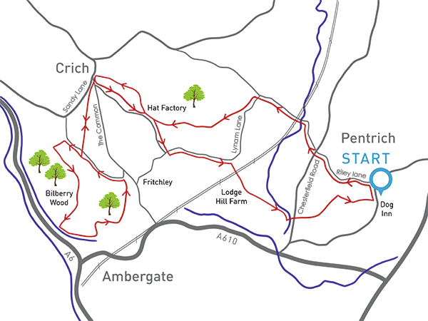 1. From The Dog Inn Pentrich go up the main road towards Swanwick, then turn left onto Riley Lane, signposted Fritchley and Crich.