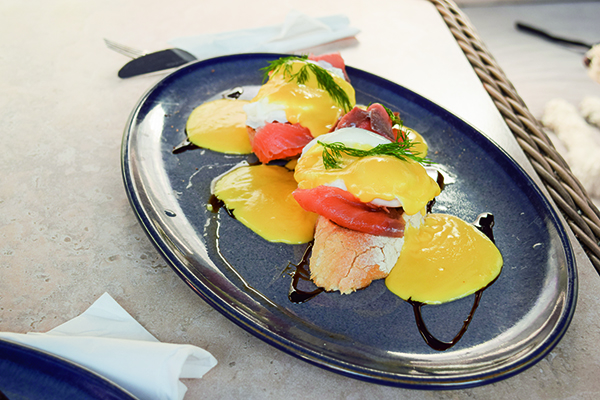 Susan’s choice was more brunch than breakfast: eggs royal. A round of farmhouse toast covered with a small pile of sliced smoked salmon. This was topped with two perfectly poached eggs and accompanied with a smooth hollandaise sauce. The slightly salty salmon provided all the seasoning the meal required.
